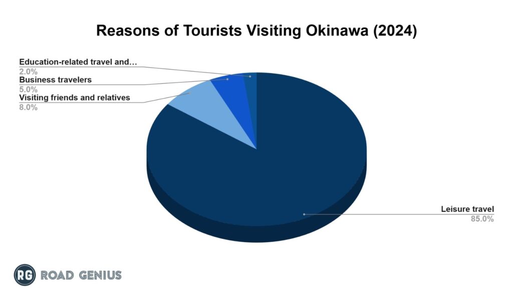 Okinawa attracts visitors primarily for leisure travel (85%), with tourists enjoying its beaches, culture, and tropical atmosphere in 2024.