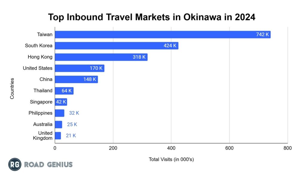 - Okinawa recorded approximately 9.67 million total visitors (domestic and international) in 2024, about 95% of the pre-pandemic peak.