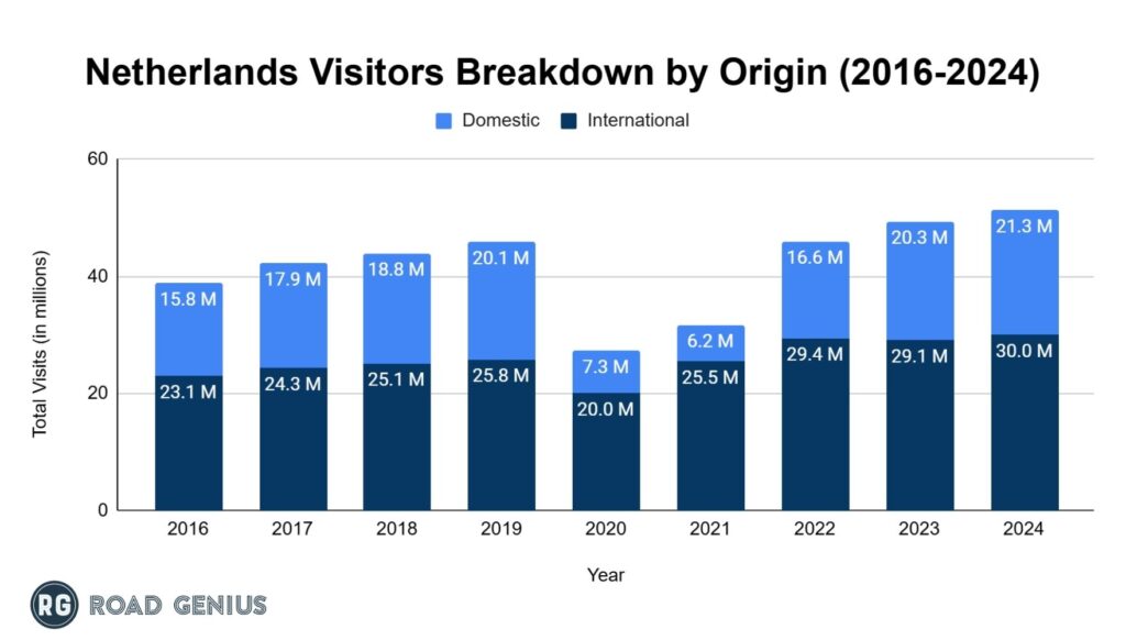 The Netherlands welcomed 21.28 million international visitors in 2024, while domestic visitors accounted for 30.01 million.