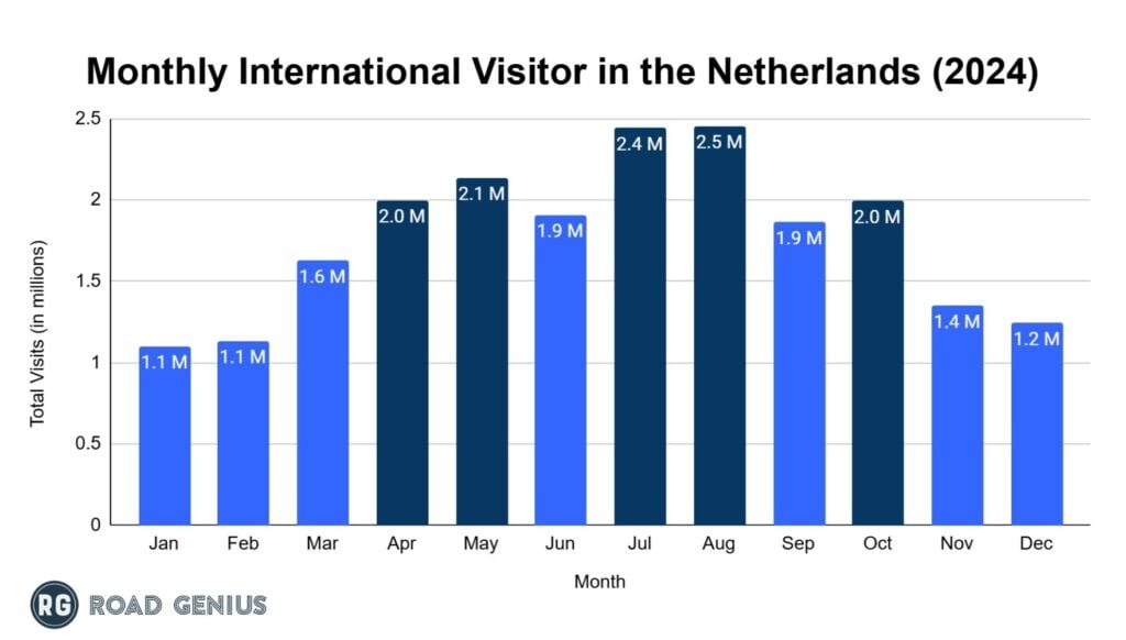 - In August, the Netherlands had its highest number of visitors, with 2.45 million people drawn to the peak summer holiday season, highlighted by major festivals and cultural events.