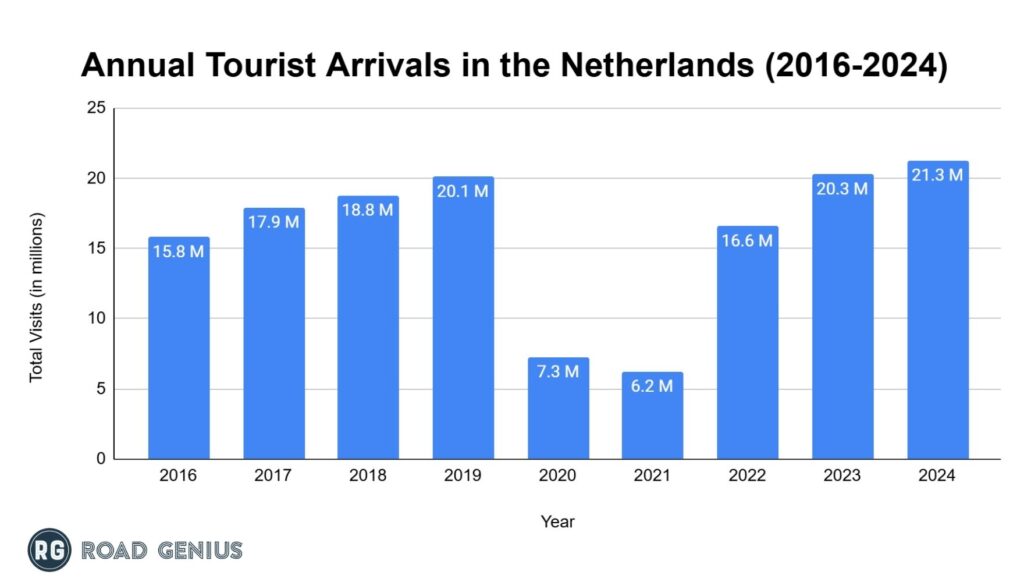 - According to UNWTO, The Netherlands recorded 21.28 million tourist arrivals in 2024, ranking 14th globally.