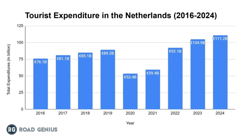- Tourist Spending: Tourist spending in the Netherlands reached nearly €111.2 billion in 2024, surpassing pre-pandemic levels, with a significant increase driven by domestic tourism.2