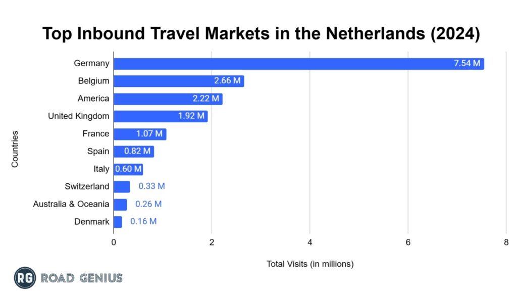 - In 2024, Germany was the top source of international visitors to the Netherlands, accounting for 7.54 million visits with 35.5% of the overall market share.