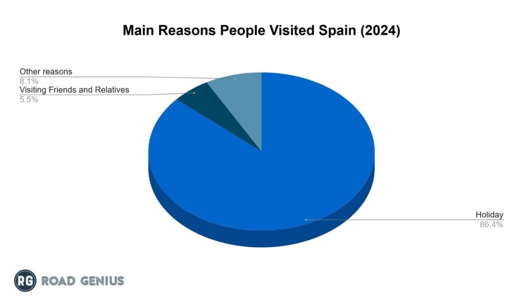 Both international and domestic tourists visited Spain primarily for holidays and leisure in 2024 with 81.05 million visits (86.4% of total visitors).3