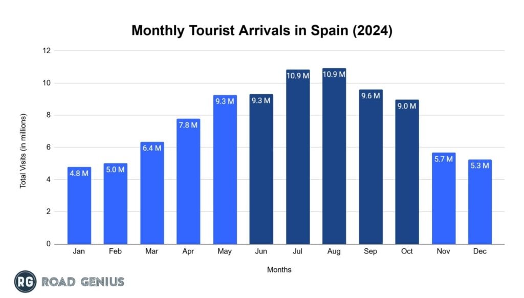 - August was the busiest month of 2024, with 10.93 million visitors, driven by peak-summer beach holidays, nationwide fiestas and school vacations across Europe.