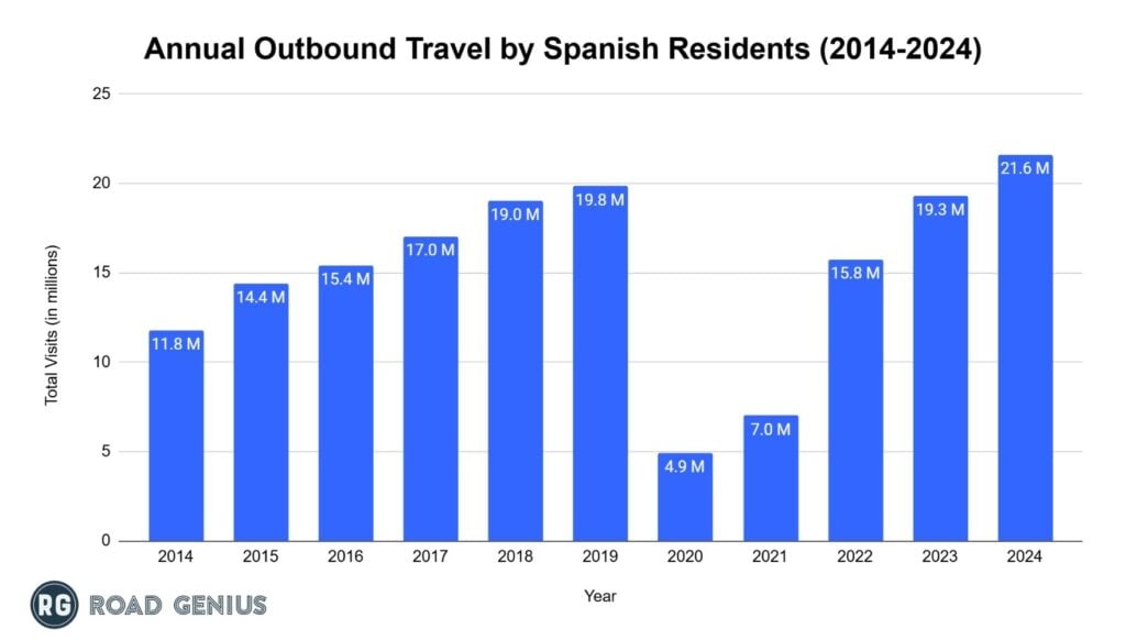 Spain is not just a global destination but a source of outbound tourism, with about 21.6 million of its people travelling overseas in 2024.2