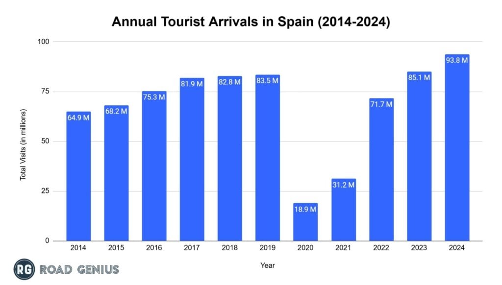 - Approximately 93.8 million international tourists visited Spain in 2024, exceeding the pre-pandemic year figure by 1.9%.2