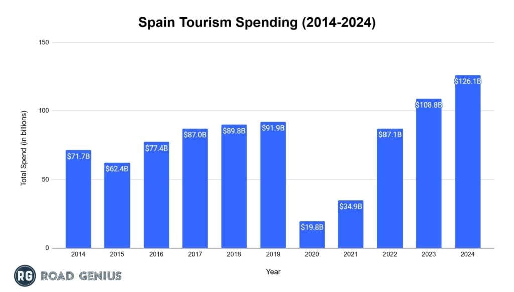 - Approximately $126.1 billion was spent by international tourists while visiting Spain in 2024.