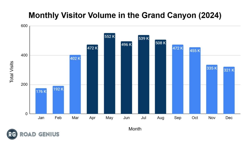 - May recorded the highest visitation, with 551,570 visitors, making it the peak month for tourism at the Grand Canyon.