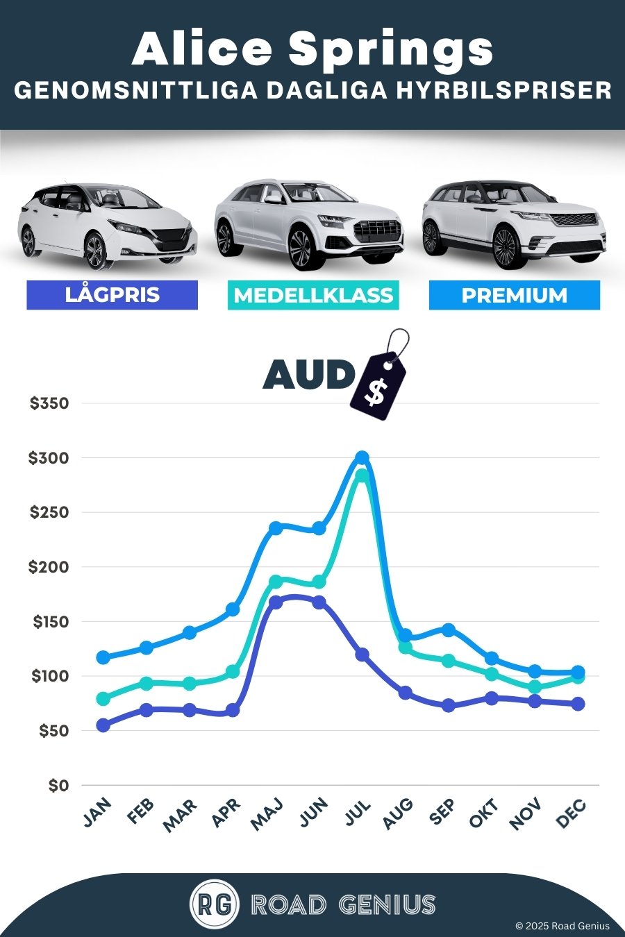 Med Road Genius är det enkelt att hitta bra hyrbilspriser i Alice Springs och över hela Australien. Jämför och boka på ett och samma ställe – smidigt och enkelt. En hyrbil är i stort sett ett måste för att uppleva The Red Centre, från Uluru till West MacDonnell Ranges. Vi hjälper dig att jämföra bilar och hitta en upphämtningsplats som passar dig, antingen på flygplatsen eller inne i stan.