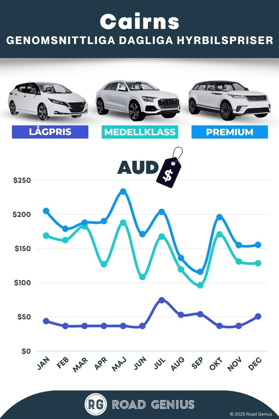 I genomsnitt kostar biluthyrning i Cairns omkring AUD 157 per dag, med de billigaste hyrorna från AUD 37 per dag.