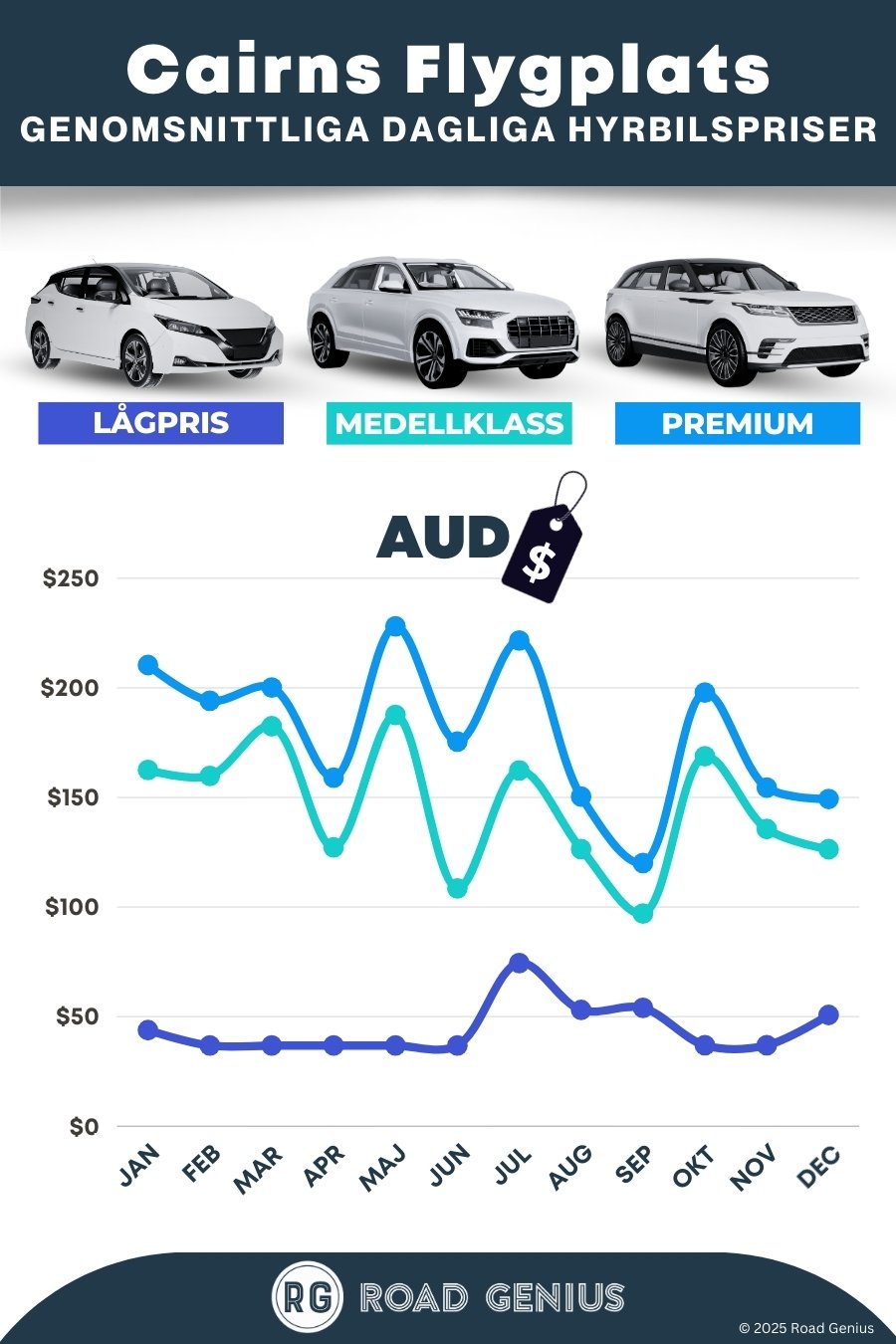 I genomsnitt kostar biluthyrning på Cairns flygplats (CNS) cirka AUD 159 per dag, och de billigaste hyrorna börjar på AUD 37 per dag.