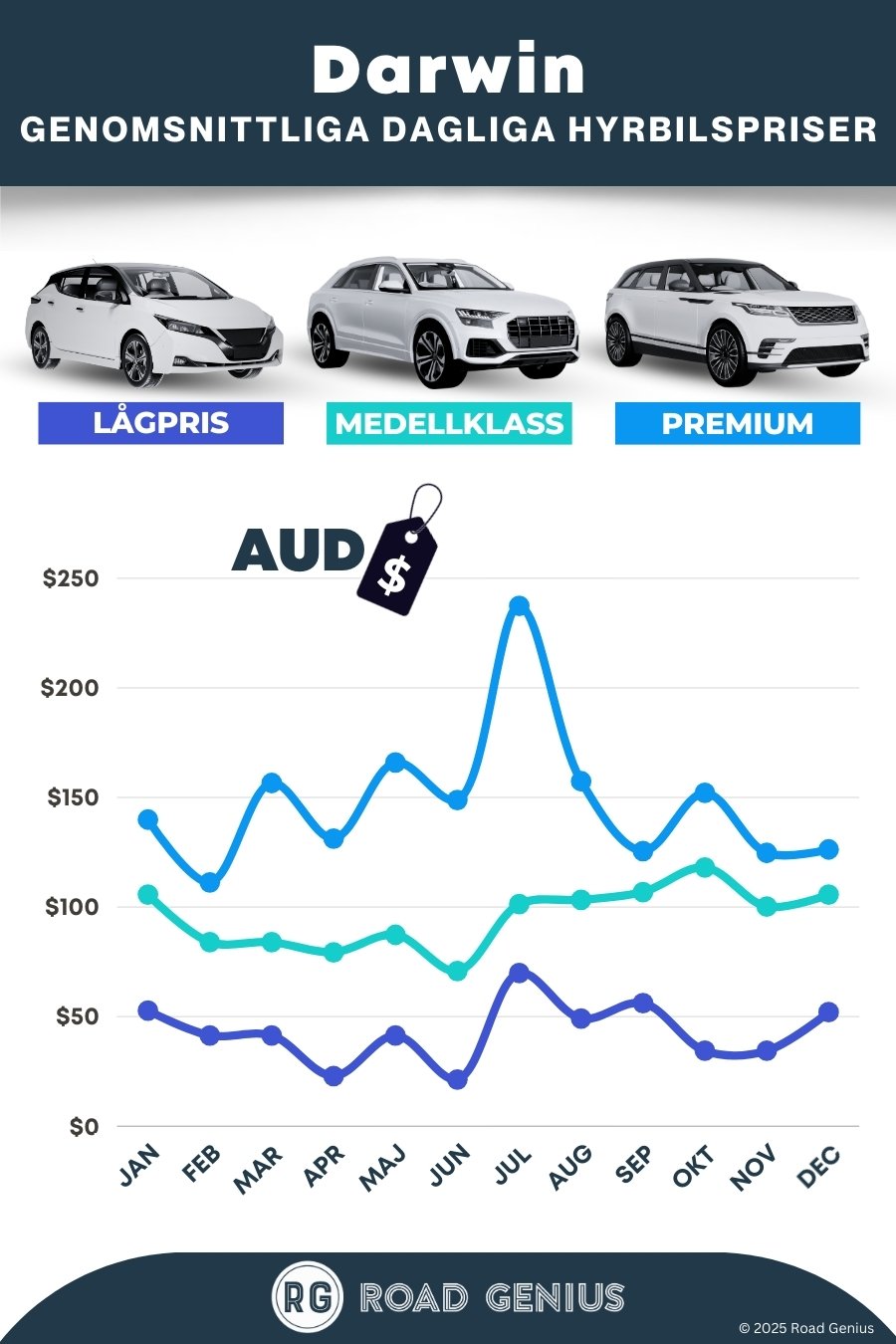 I genomsnitt kostar biluthyrning i Darwin cirka AUD 126 per dag, med de billigaste hyrorna från AUD 21 per dag.