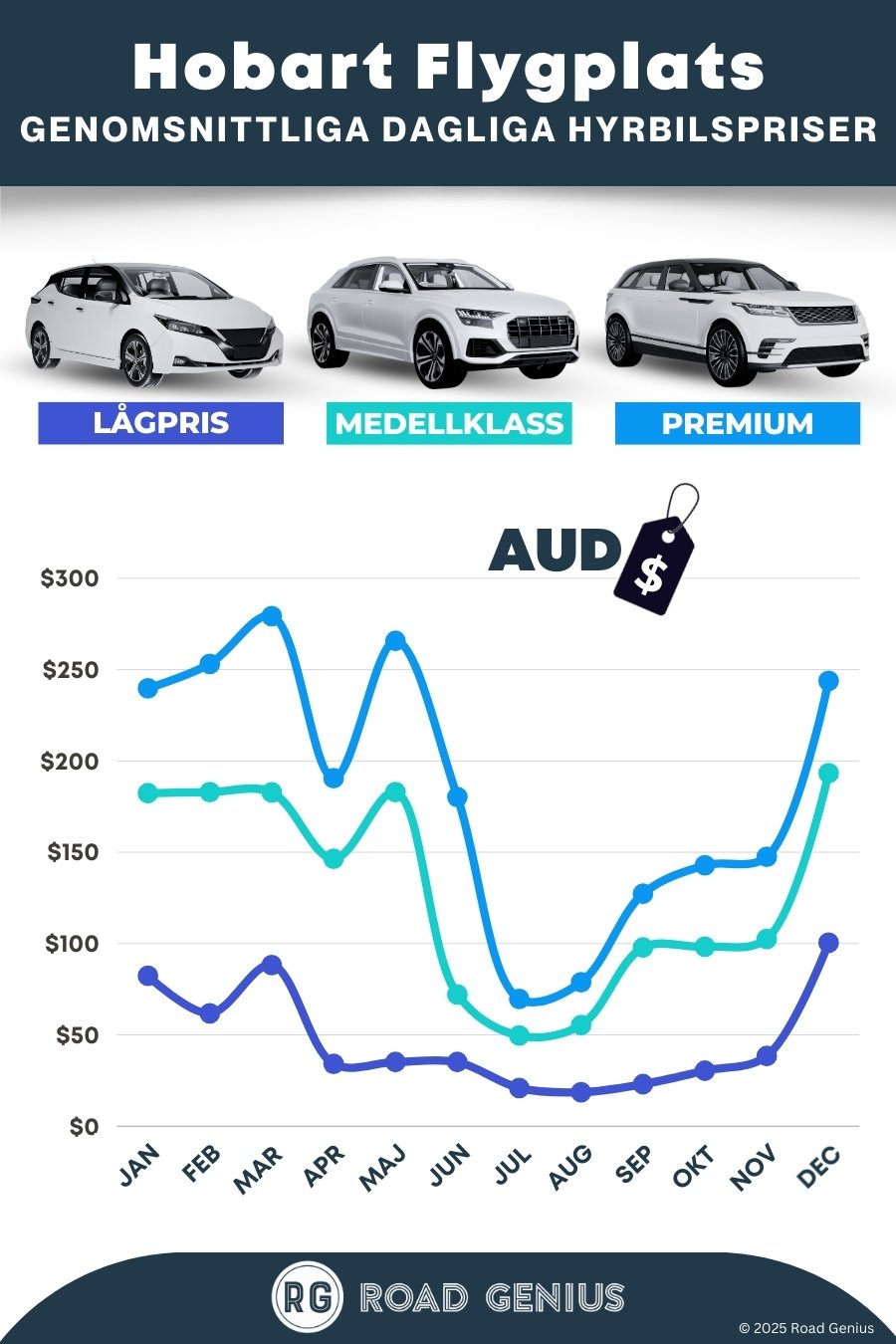 I genomsnitt kostar biluthyrning på Hobart flygplats (HBA) cirka AUD 160 per dag, med de billigaste hyrorna från AUD 19 per dag.