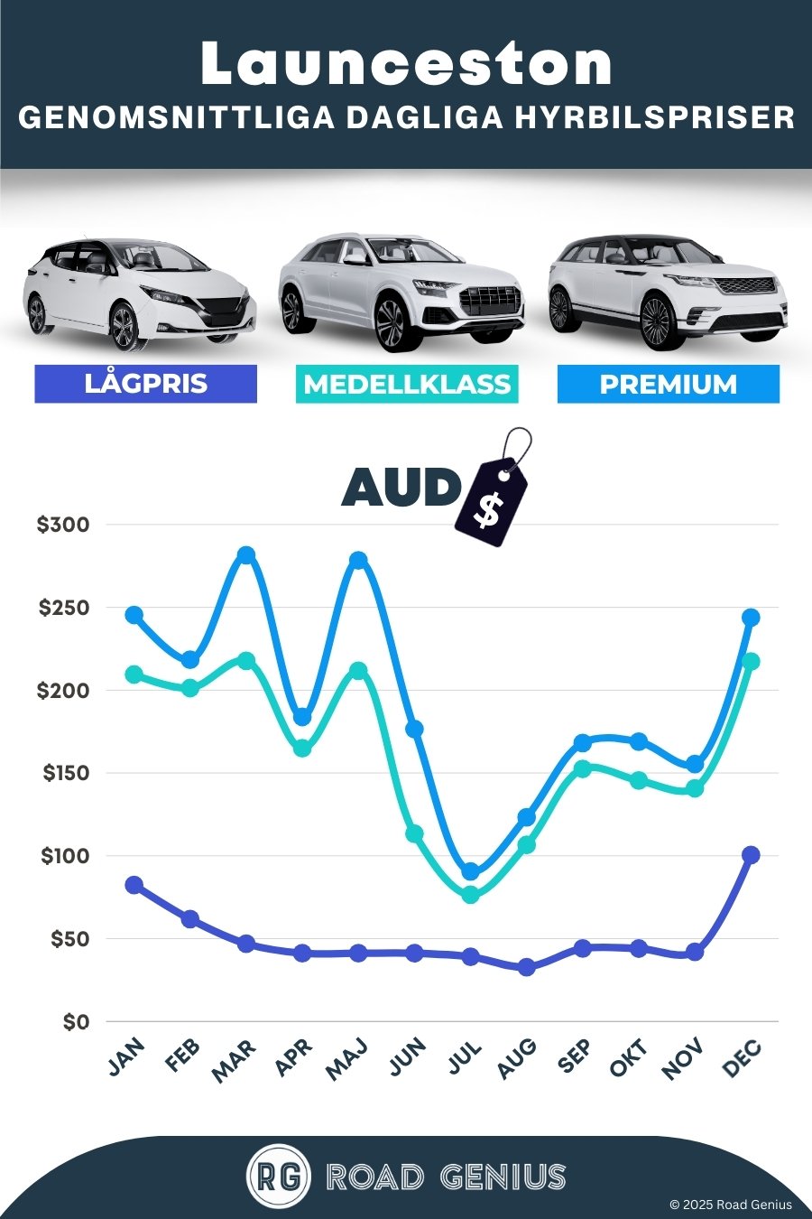 I genomsnitt kostar biluthyrning i Launceston omkring AUD 172 per dag, med de billigaste hyrorna från AUD 32 per dag.