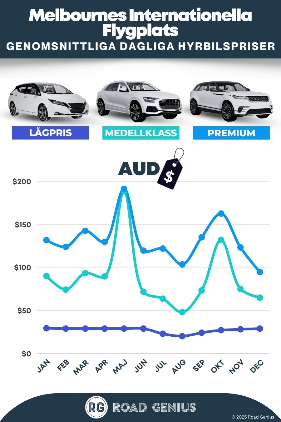 I genomsnitt kostar biluthyrning på Melbourne flygplats (MEL) omkring AUD 111 per dag, med de lägsta priserna från AUD 20 per dag.