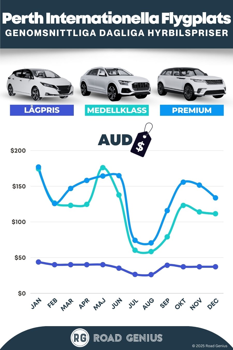 I genomsnitt kostar biluthyrning på Perth flygplats (PER) cirka AUD 124 per dag, med de billigaste priserna från AUD 26 per dag.