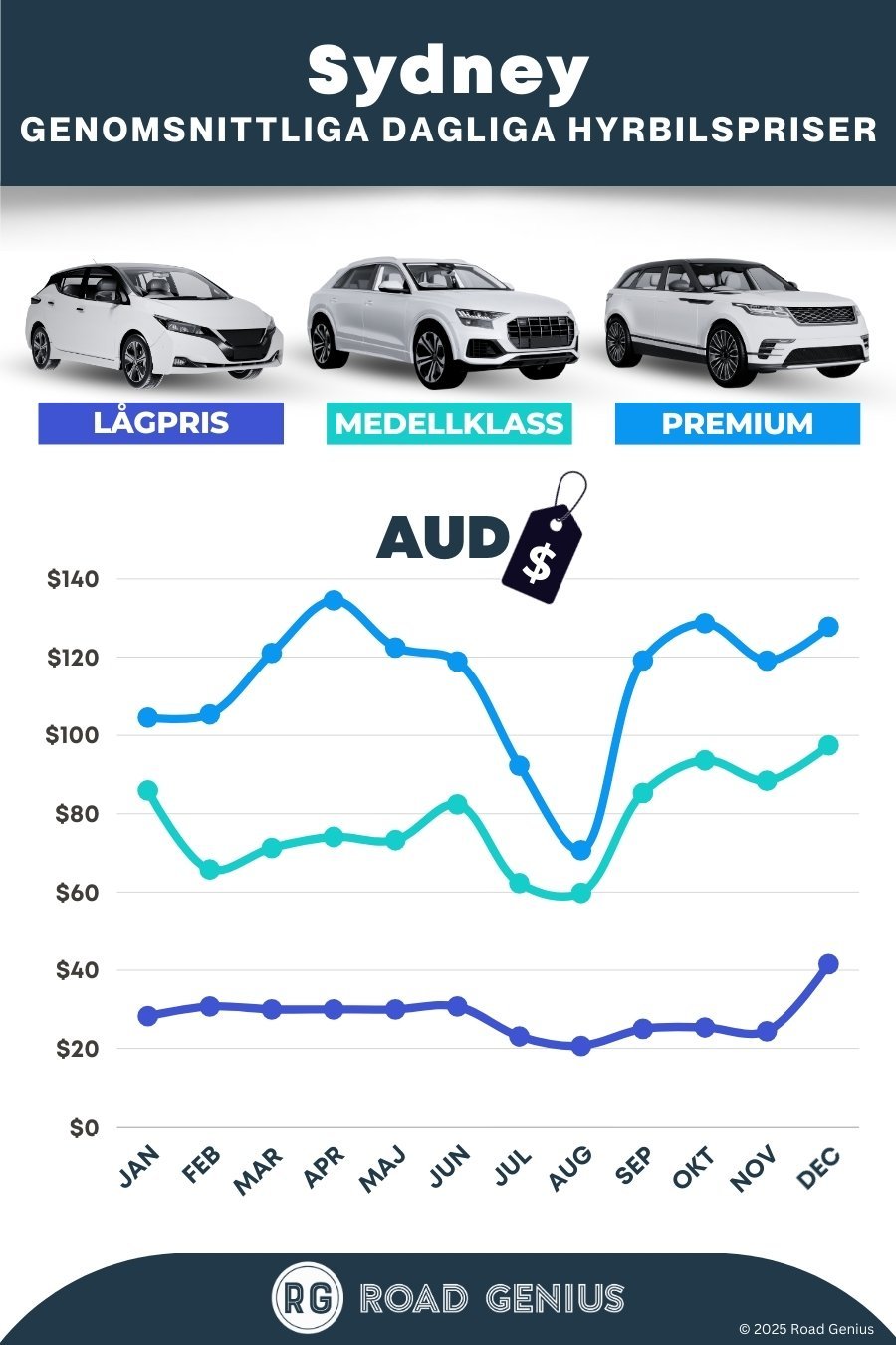 I genomsnitt kostar biluthyrning i Sydney omkring AUD 97 per dag, med de billigaste priserna från AUD 21 per dag.