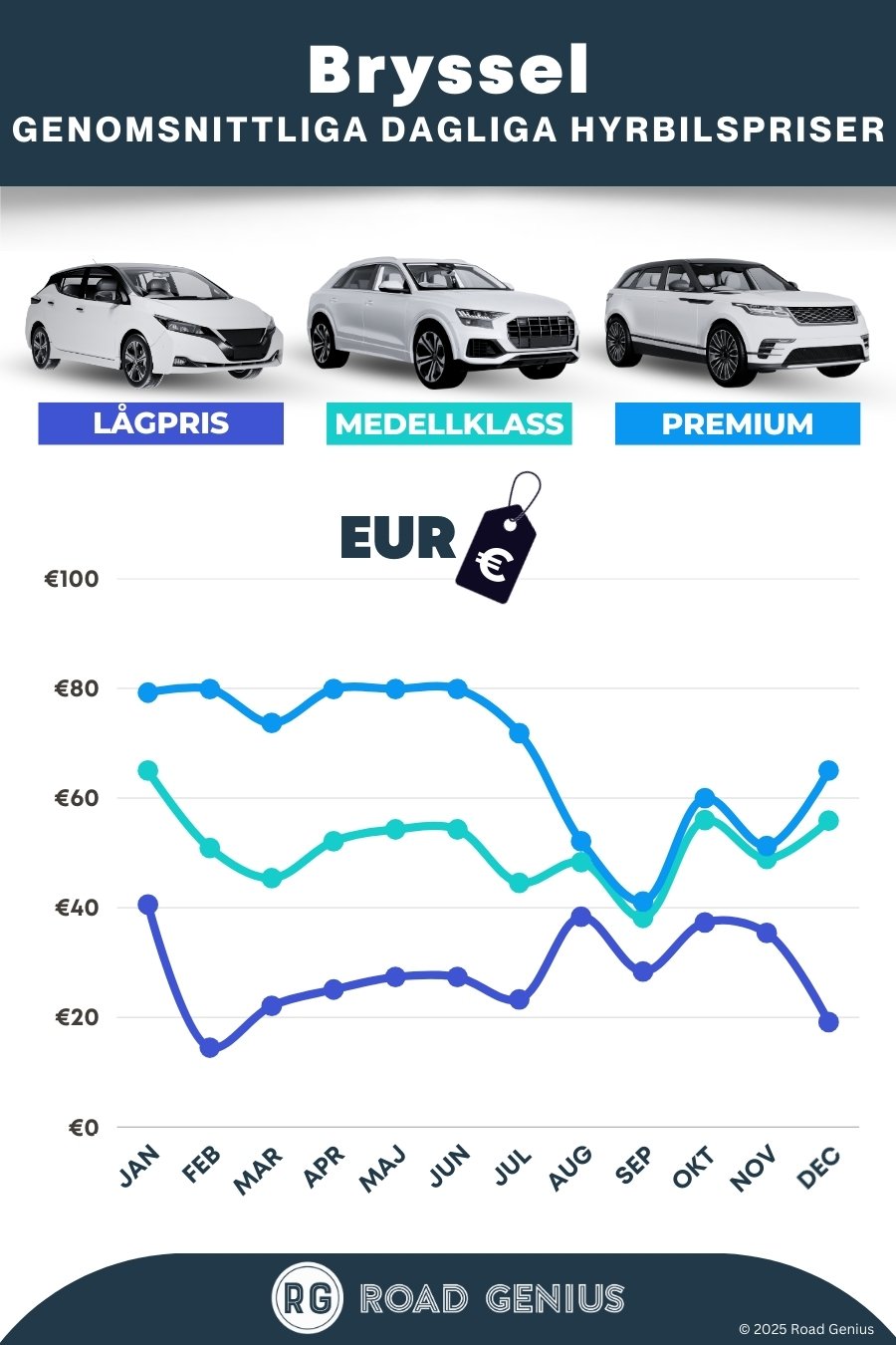 I genomsnitt kostar en bilhyra i Bryssel omkring 49 € per dag, med de billigaste priserna från 14 € per dag.