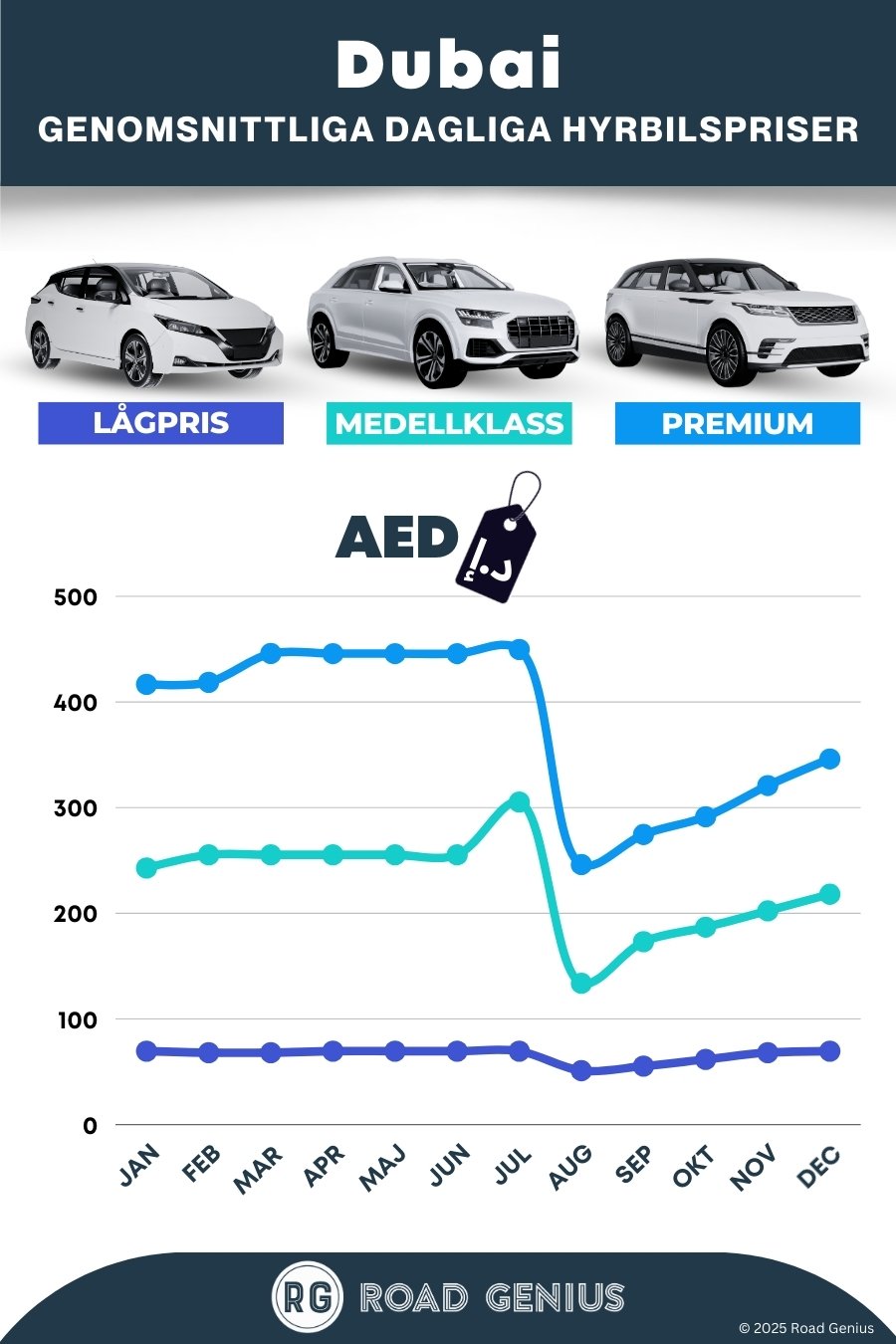 I genomsnitt kostar en bilhyra i Dubai cirka 224 AED per dag, med de billigaste alternativen från 51 AED per dag.