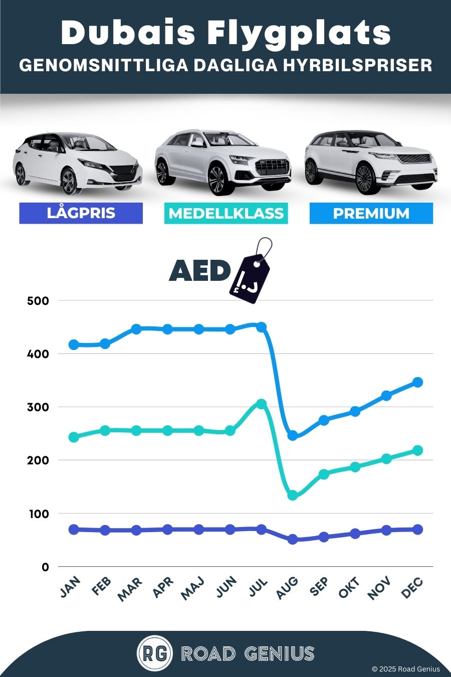 Med Road Genius hittar du enkelt de bästa priserna på hyrbilar från Dubais internationella flygplats (DXB). Jämför erbjudanden och boka smidigt på ett och samma ställe. Du kan hämta upp din bil vid Terminal 1, 2 eller 3, där de flesta stora biluthyrarna har öppet dygnet runt. Tänk på att läsa igenom villkoren för Salik-vägtullar, bränslepolicy, deposition och eventuell envägshyra till Abu Dhabi. För att få ett lägre pris under högsäsong rekommenderar vi att du bokar i god tid.