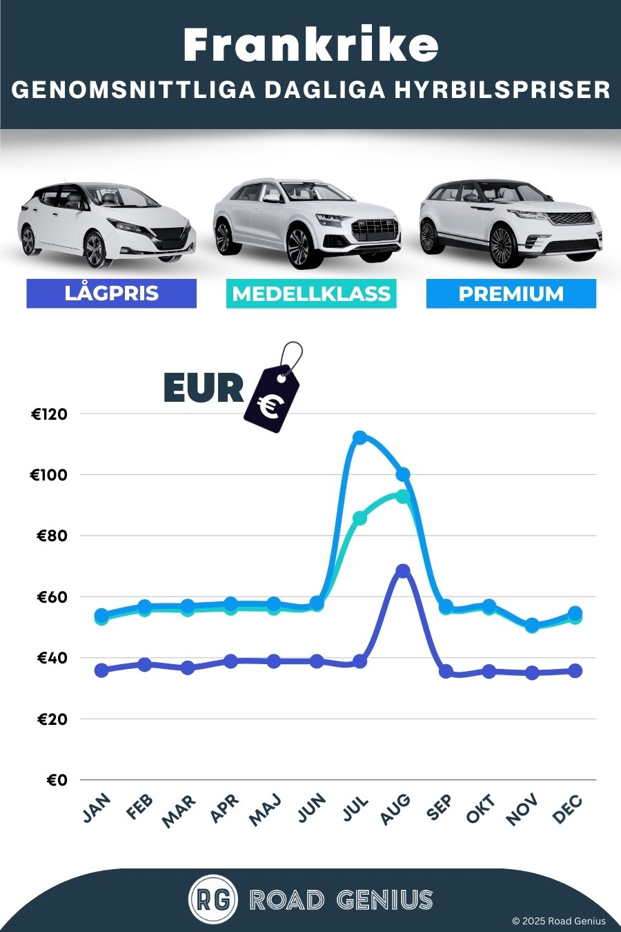 I genomsnitt kostar en bilhyra i Frankrike cirka €55 per dag, med de billigaste alternativen från €35 per dag.