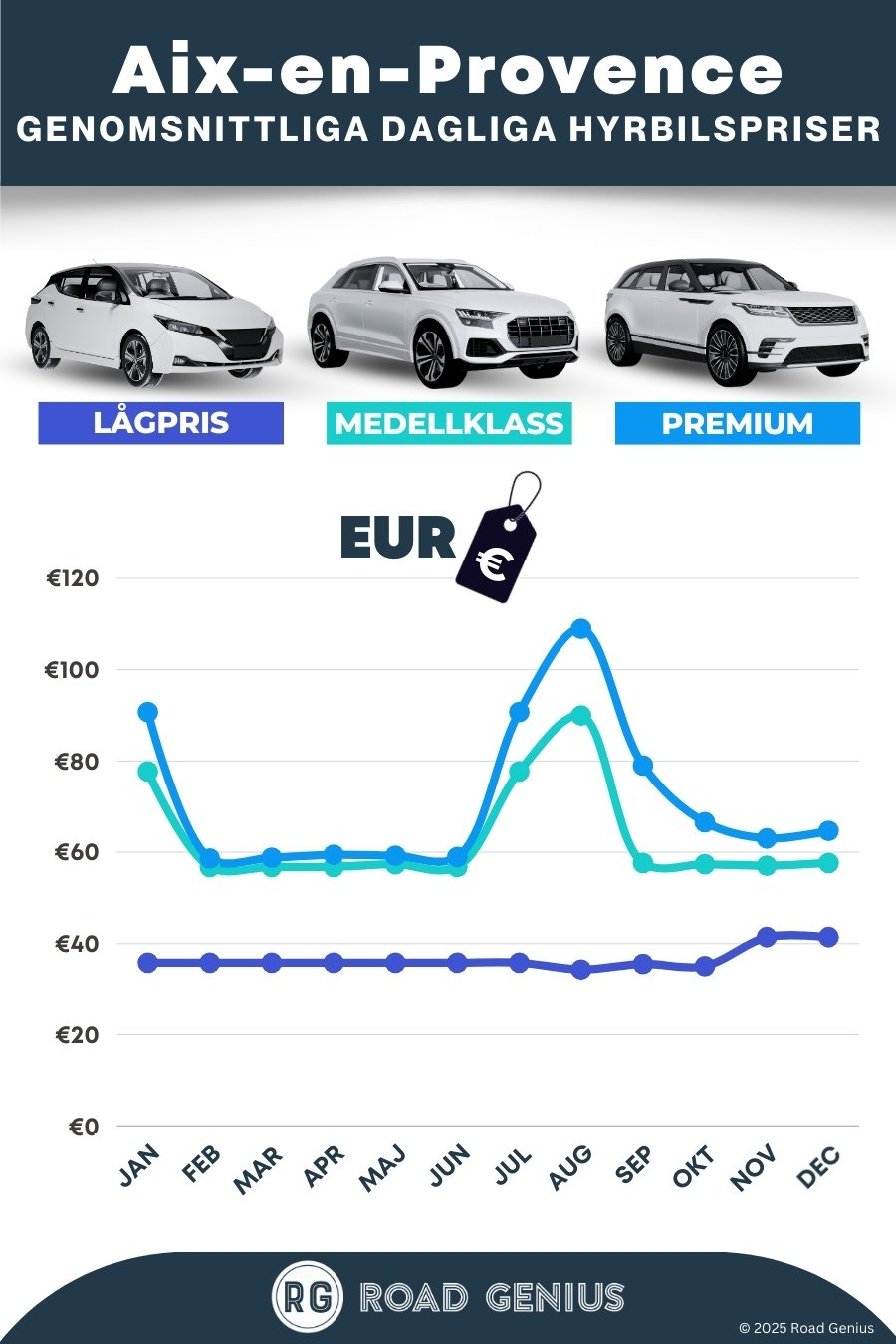 I genomsnitt kostar en bilhyra i Aix-en-Provence omkring 57 € per dag, med de billigaste priserna från 34 € per dag.