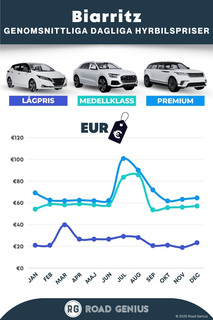 Jämför upphämtningsplatser. Att hyra i Biarritz centrum är ofta 10–15 % billigare än på flygplatsen. Jämför även med Bayonne (8 km bort), som kan ha lägre priser under högsäsong.