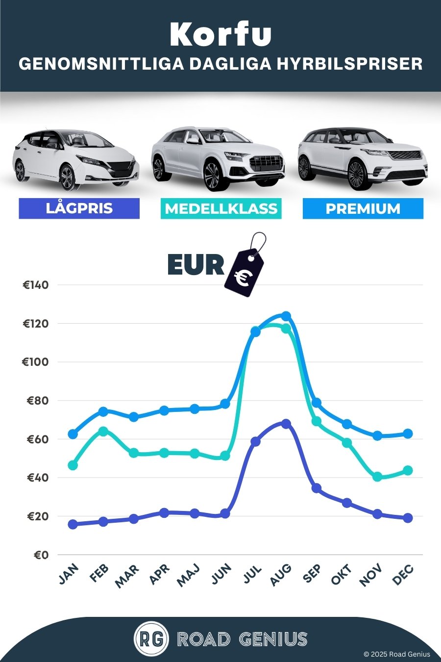 I genomsnitt kostar en bilhyra i Korfu omkring 57 € per dag, med de billigaste priserna från 16 € per dag.