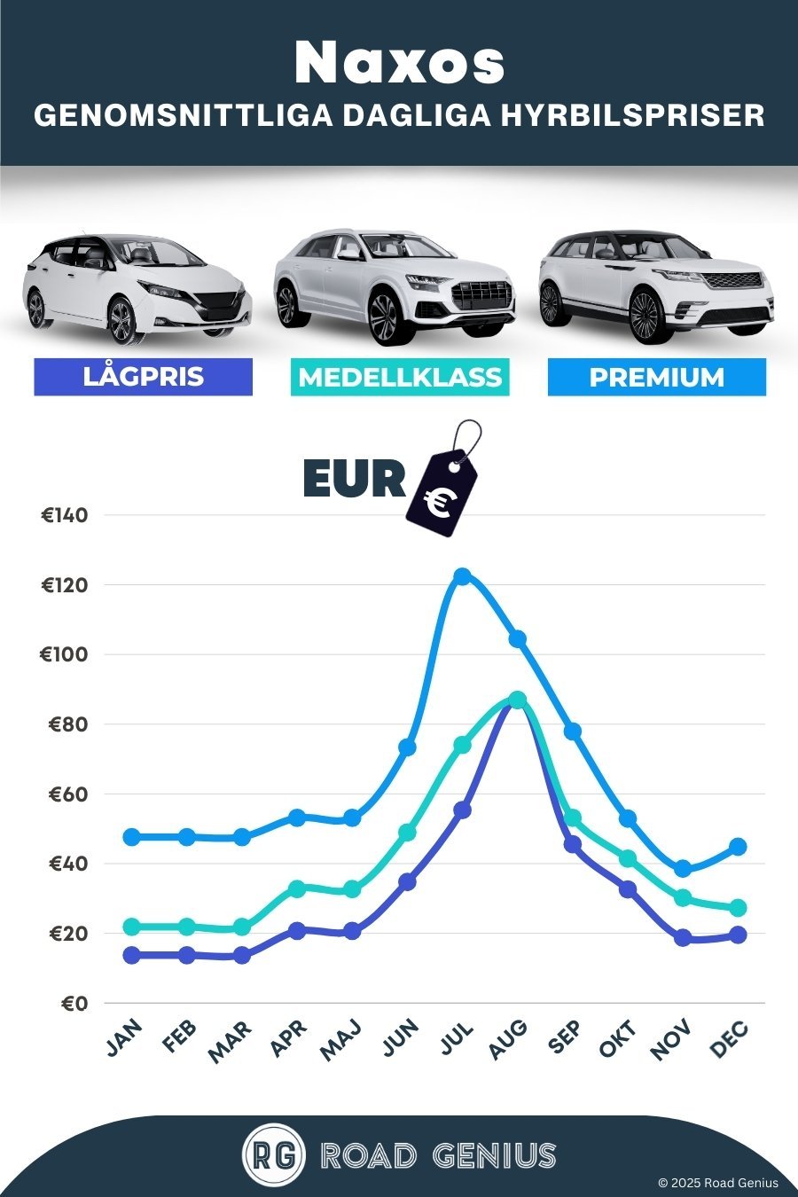 I genomsnitt kostar en bilhyra i Naxos omkring 45 € per dag, med de billigaste priserna från 14 € per dag.