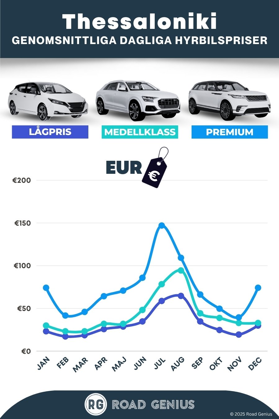 I genomsnitt kostar en bilhyra i Thessaloniki omkring 49 € per dag, med de billigaste priserna från 17 € per dag.