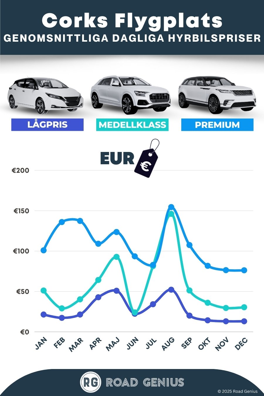 I genomsnitt kostar en bilhyra på Corks flygplats omkring 63 € per dag, med de billigaste priserna från 13 € per dag.