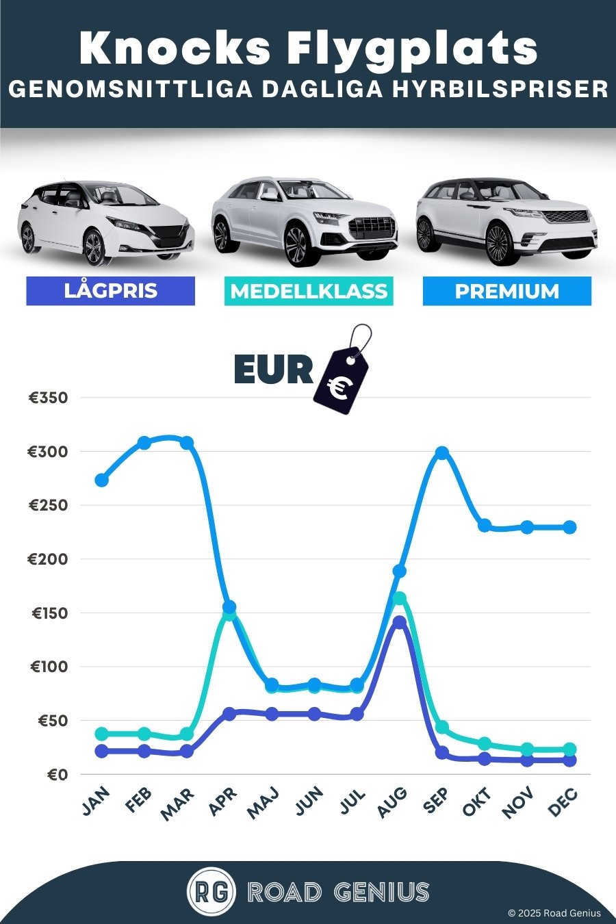 I genomsnitt kostar en bilhyra på Knocks flygplats omkring 104 € per dag, med de billigaste priserna från 13 € per dag.