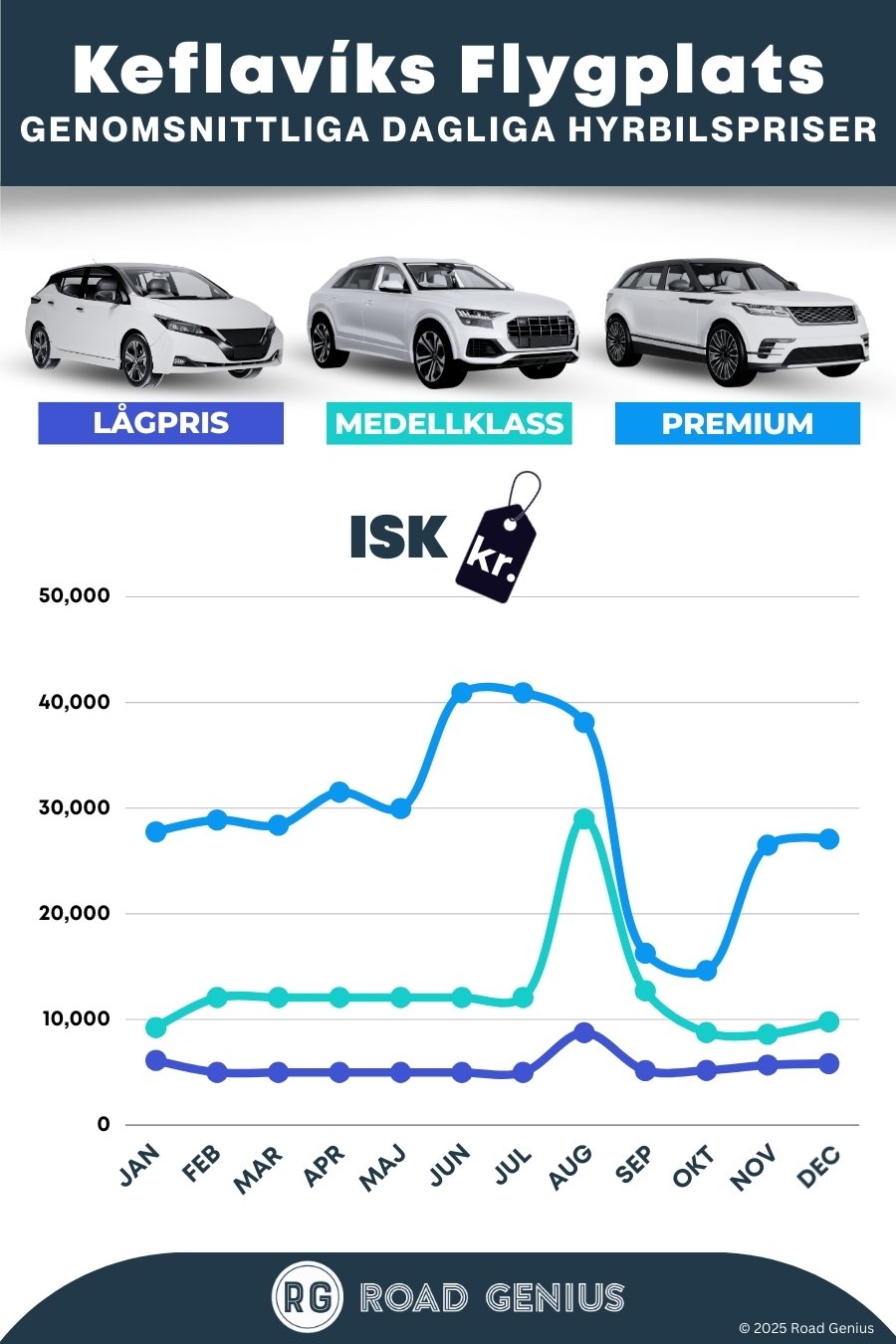 I genomsnitt kostar en bilhyra på Keflaviks flygplats omkring 15 750 ISK per dag, med de billigaste priserna från 4 973 ISK per dag.