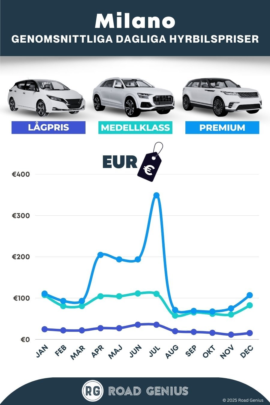 Det är enkelt att hitta en prisvärd hyrbil i Milano med Road Genius. Jämför priser från dussintals hyrbilsbolag över hela Italien utan bokningsavgifter. Hämta bilen på Malpensa, Linate, Bergamo eller i centrala Milano, och välj mellan ekonomiklass, automat och SUV för resor till Comosjön, Gardasjön och Alperna. Jämför villkor som bränslepolicy, fri körsträcka och avgifter för envägshyra innan du bokar – och ta del av våra tips om ZTL-zoner, vägtullar och parkering.