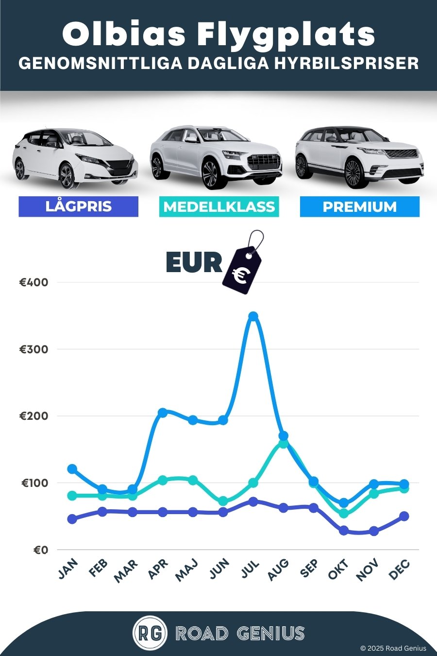I genomsnitt kostar en bilhyra på Olbias flygplats omkring 98 € per dag, med de billigaste priserna från 28 € per dag.