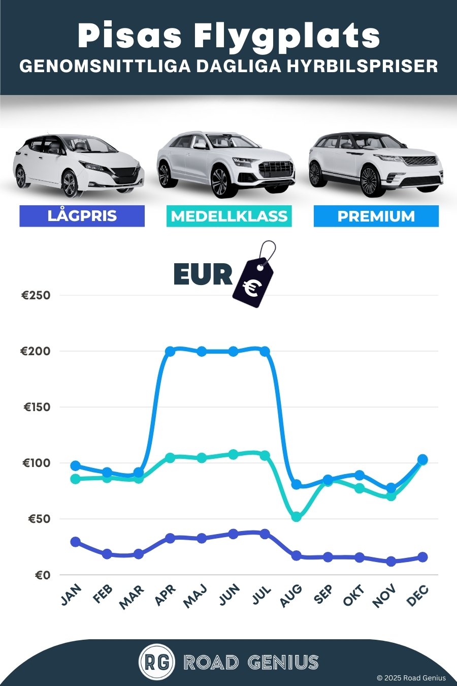 I genomsnitt kostar en bilhyra på Pisas flygplats omkring 80 € per dag, med de billigaste priserna från 12 € per dag.