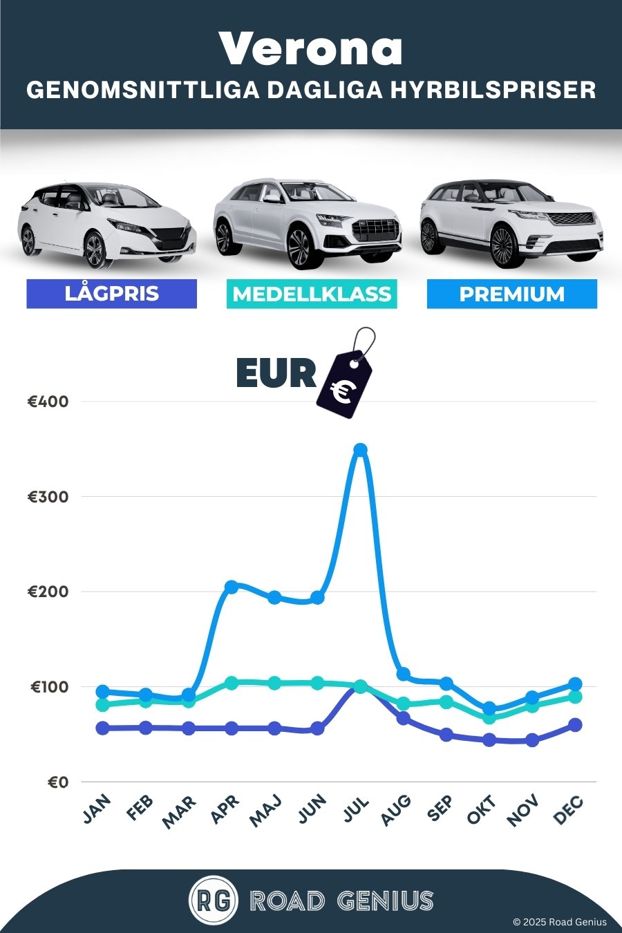 Hitta de bästa priserna på hyrbil i Verona med Road Genius. Jämför allt från småbilar och SUV:ar till minibussar – helt utan bokningsavgifter. Vi jämför priser från Verona flygplats, tågstationen Porta Nuova och uthyrningskontor i centrum – boka i god tid inför sommaren och operasäsongen. Med hyrbil tar du dig enkelt via motorvägarna A4 och A22 till populära resmål som Gardasjön, Valpolicella, Venedig och Milano. Här får du även våra bästa tips om ZTL-zoner och parkering.