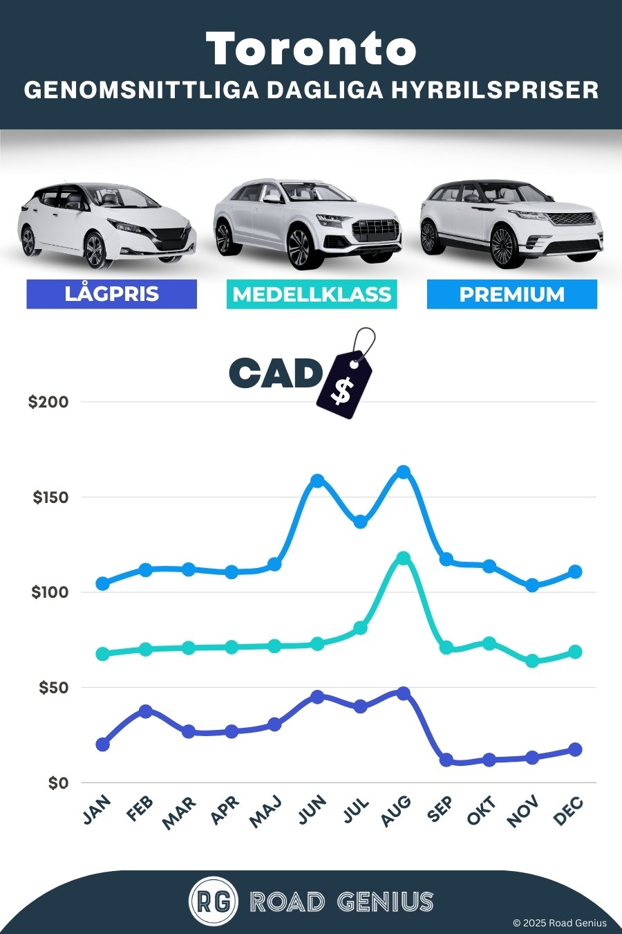 I genomsnitt kostar en bilhyra i Toronto omkring CAD $75 per dag, med de billigaste priserna från CAD $12 per dag.