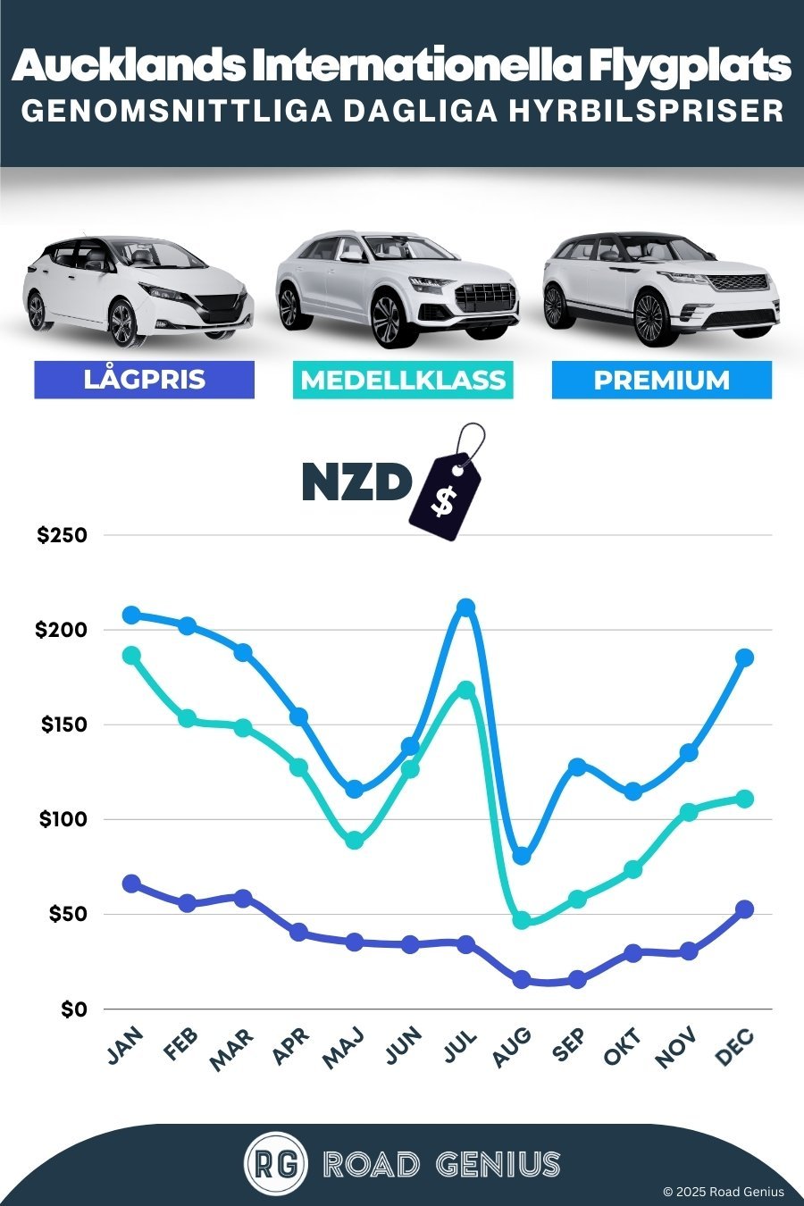 I genomsnitt kostar en bilhyra på Aucklands internationella flygplats cirka NZD $103 per dag, med de billigaste alternativen från NZD $16 per dag.