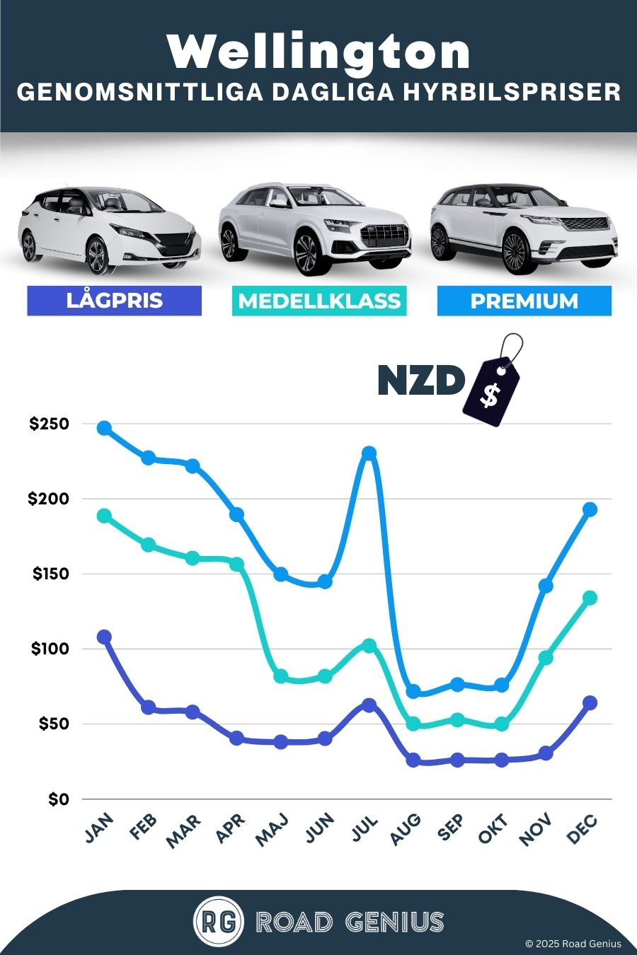 I genomsnitt kostar en bilhyra i Wellington cirka NZD $108 per dag, med de billigaste alternativen från NZD $26 per dag.