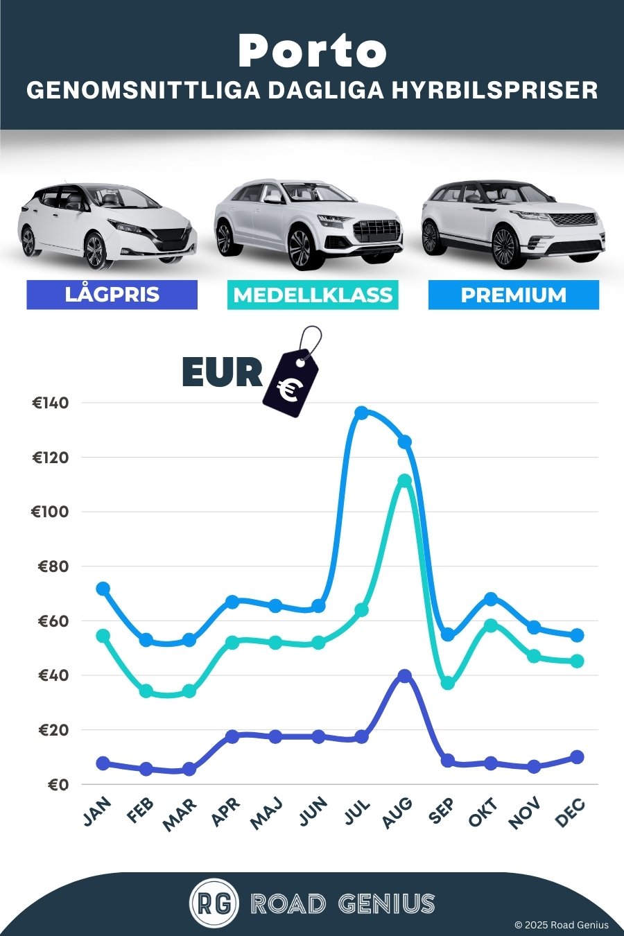 I genomsnitt kostar en bilhyra i Porto cirka €47 per dag, med de billigaste alternativen från €6 per dag.