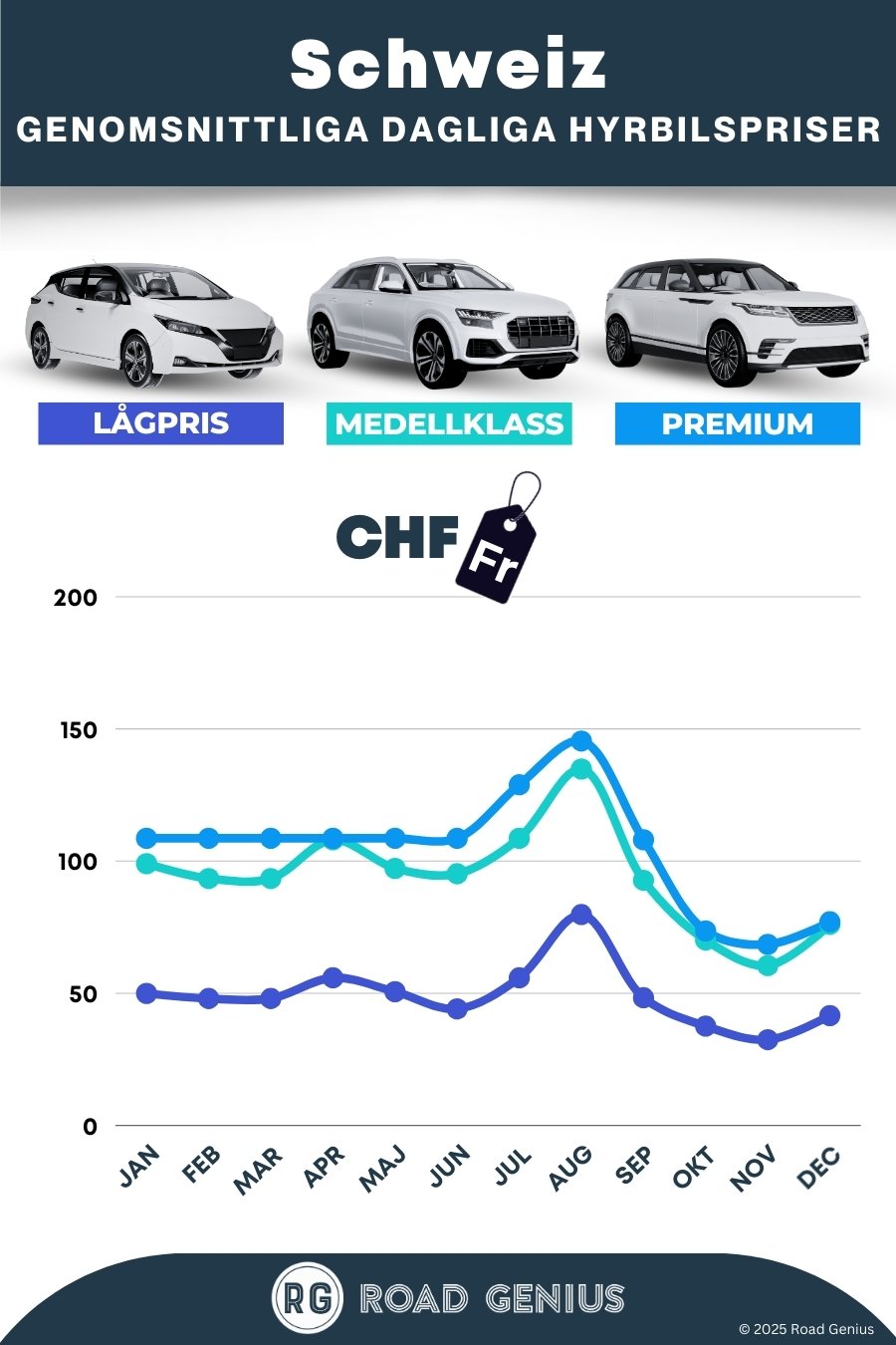 I genomsnitt kostar en bilhyra i Schweiz cirka CHF 83 per day, med de billigaste alternativen från CHF 32 per day.