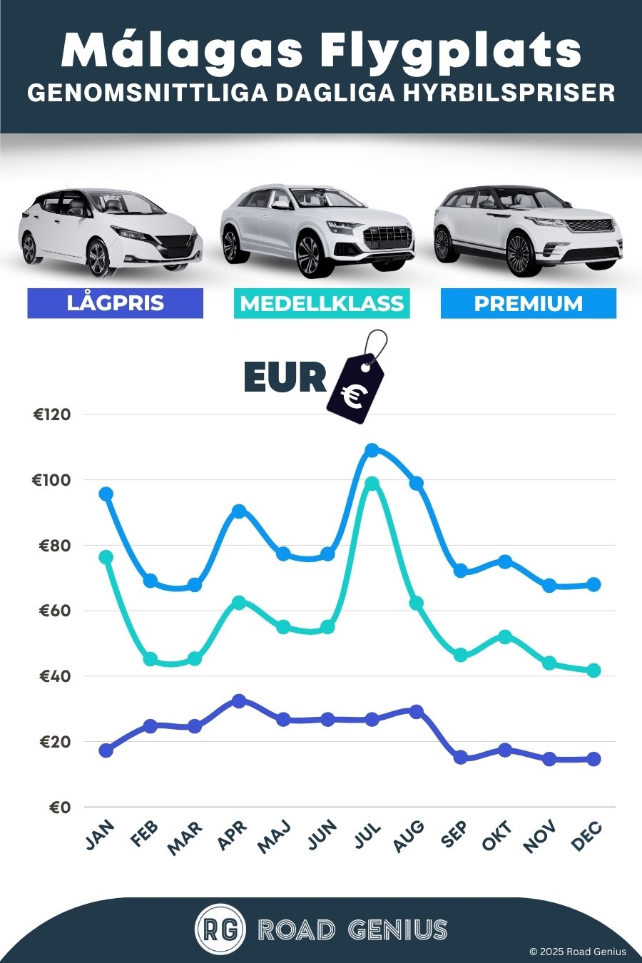 I genomsnitt kostar en bilhyra på Malagas flygplats omkring 53 € per dag, med de billigaste priserna från 15 € per dag.