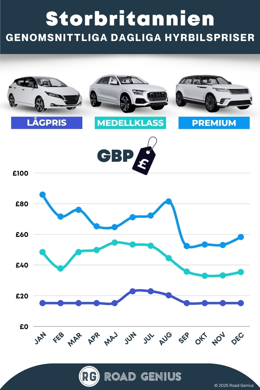 I genomsnitt kostar en bilhyra i Storbritannien cirka €43 per day, med de billigaste alternativen från €15 per day.