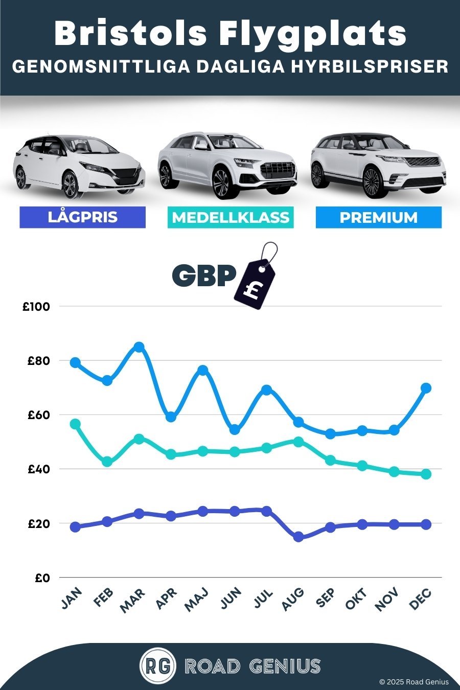 I genomsnitt kostar en bilhyra på Bristols flygplats cirka €44 per dag, med de billigaste alternativen från €15 per dag.