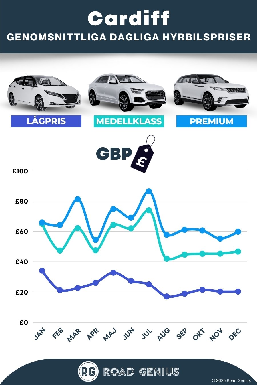 I genomsnitt kostar en bilhyra i Cardiff cirka €48 per dag, med de billigaste alternativen från €17 per dag.
