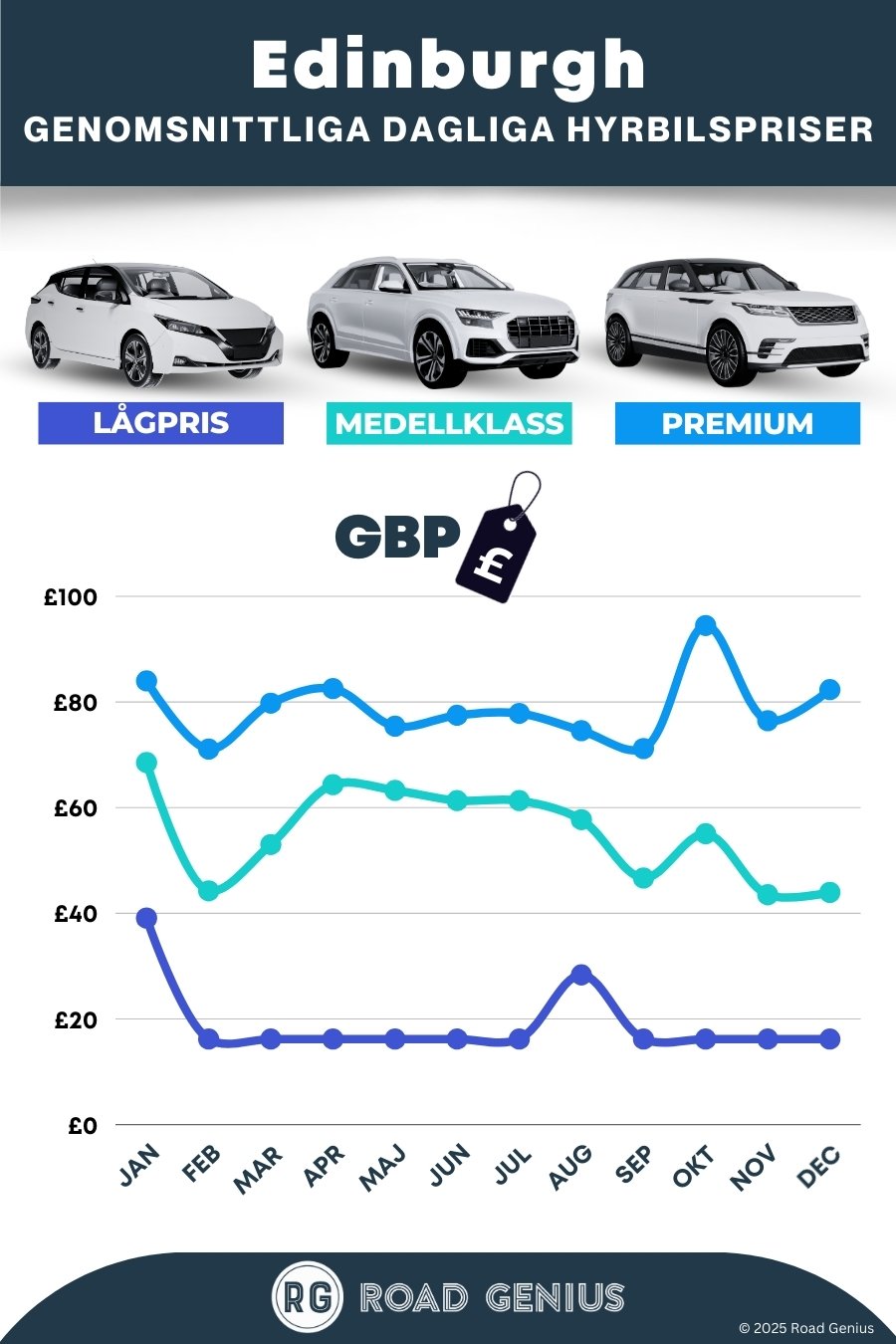 I genomsnitt kostar en bilhyra i Edinburgh cirka €51 per dag, med de billigaste alternativen från €16 per dag.