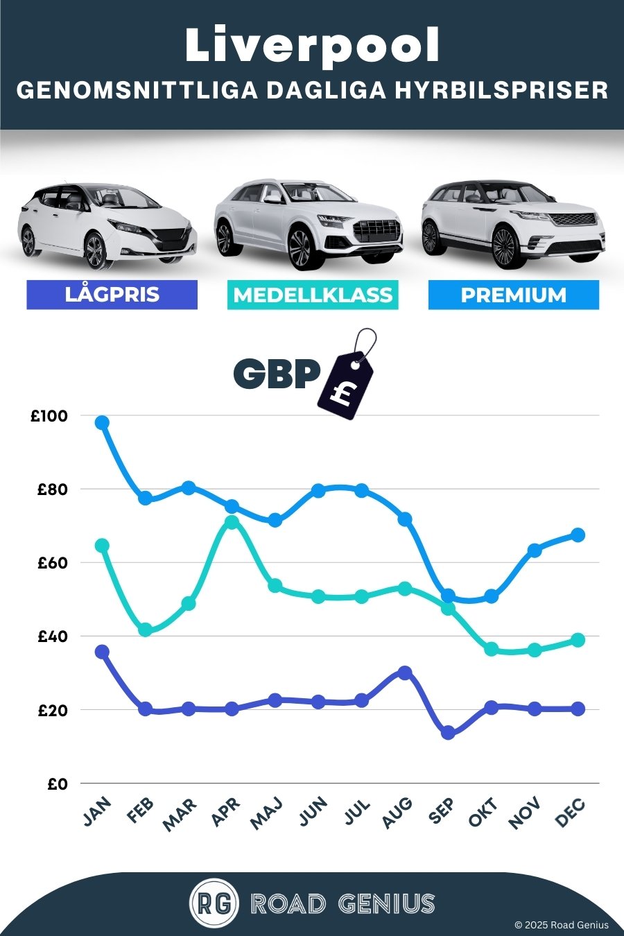 Med Road Genius är det enkelt att hitta en hyrbil i Liverpool. Jämför priser från dussintals hyrbilsbolag i Storbritannien – utan bokningsavgifter. Hämta upp din hyrbil i centrum, på Liverpool John Lennon Airport eller vid tågstationen Lime Street och jämför priser på bilar med automat, SUV:ar och familjebilar. Välj ett erbjudande med fri körsträcka och planera utflykter till Manchester, Chester, norra Wales och Lake District.