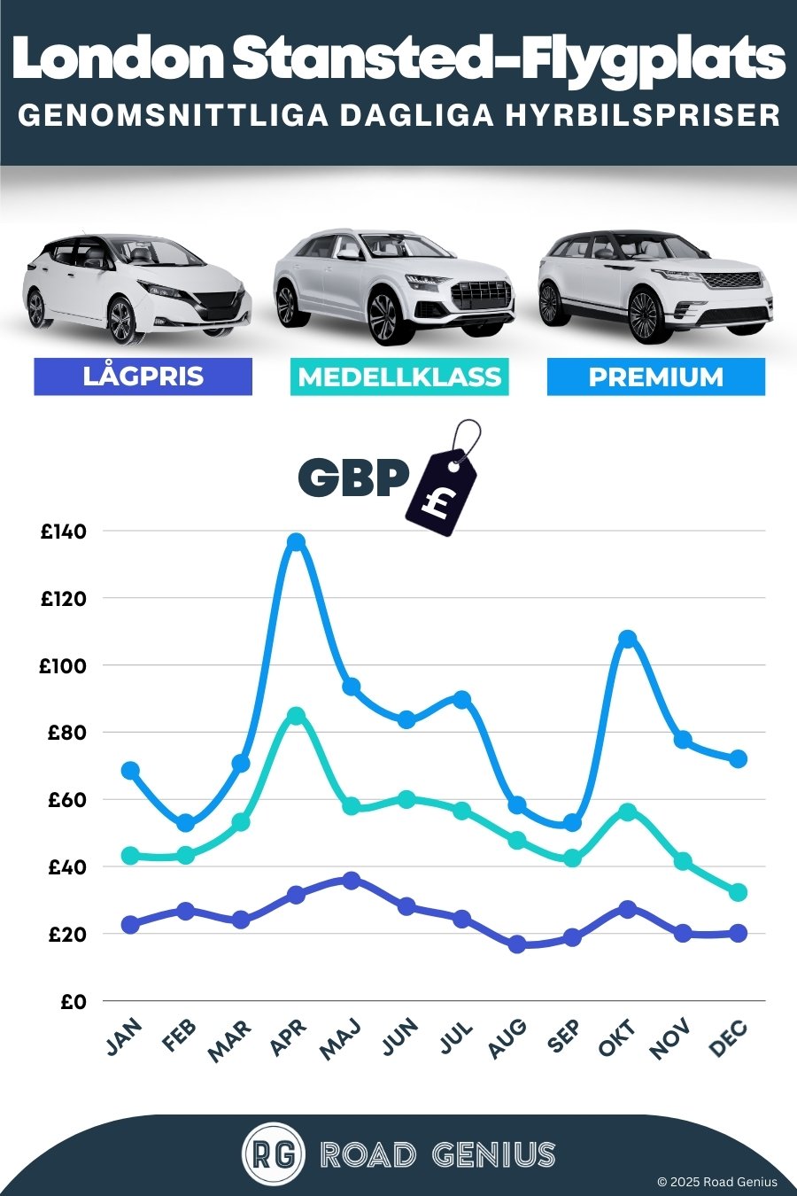 I genomsnitt kostar en bilhyra på London Stansted-flygplats cirka €52 per dag, med de billigaste alternativen från €17 per dag.